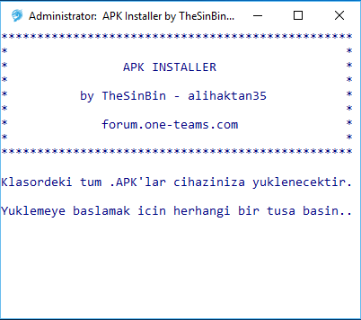 Yüklemek istediğiniz .APK'ları program ile aynı klasör içine atın ve yüklemeyi başlatın.