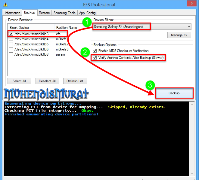 Bu duruma geldikten sonra Backup kısmına geçiniz, Device Filters kısmından Cihazınızı seçiniz, ondan sonra Solda EFS olanı seçin geri kalanı seçmenize gerek yok ve Backup'a basınız.