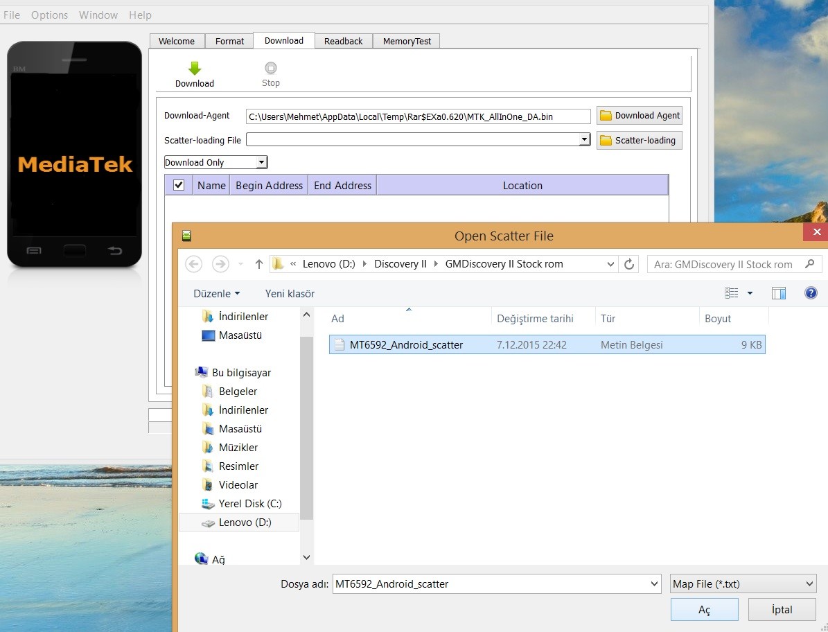 Ayarlar resimdeki gibi olacak ardından scatter-loadinge tıklıyoruz ve indirdigimiz romdaki MT6592_Android_scatter dosyasını gösteriyoruz.