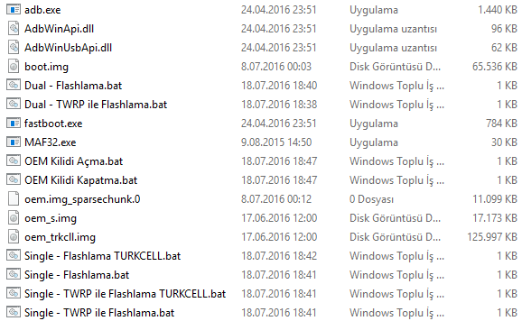 Tek yapmanız gereken cihaz kapalıyken ses kısma+güç butonlarıyla fastboot mode'a almak ve klasörden size uygun olan bat'ı seçmek.