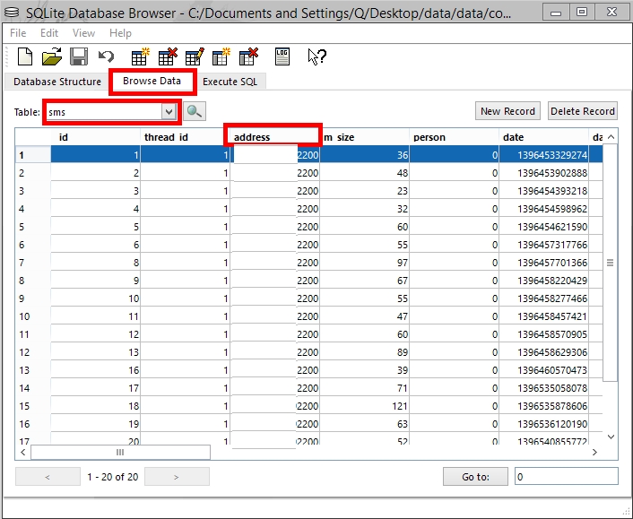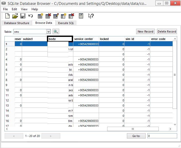 \data\data\com.android.providers.telephony\databases klasörüne girip mmssms dosyasını Sql Lite Browser uygulamasına sürükleyip bırakın. Üst kısımda Browse Data sekmesine gelerek hemen altındaki table sekmesini açıp sms yazan kısmı seçin, burası mesajlarınız. address sekmesi sms gönderip aldığınız kişinin numarısıdır, body sekmesinde ise mesaj içeriği yer almaktadır.