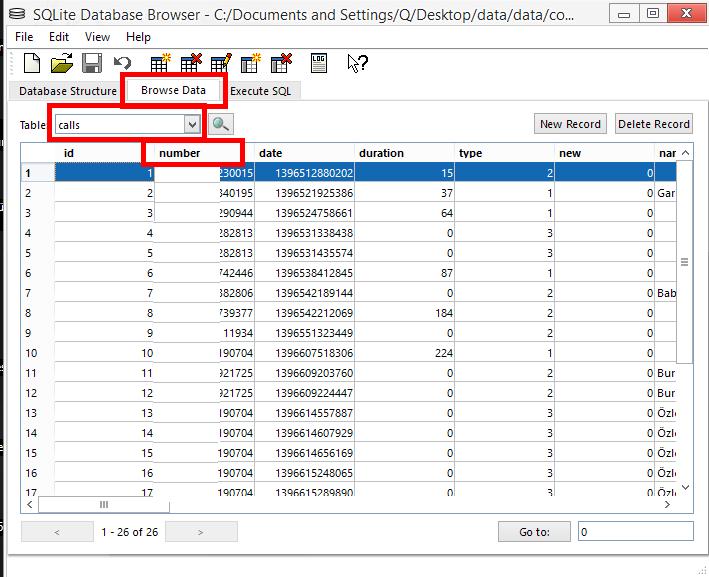 Şimdi table sekmesinden calls seçtiğinizde ise arama kayıtlarınıza ulaşacaksınız. number başlığı altındaki numaralar çağrı kaydındaki numaralarınız.