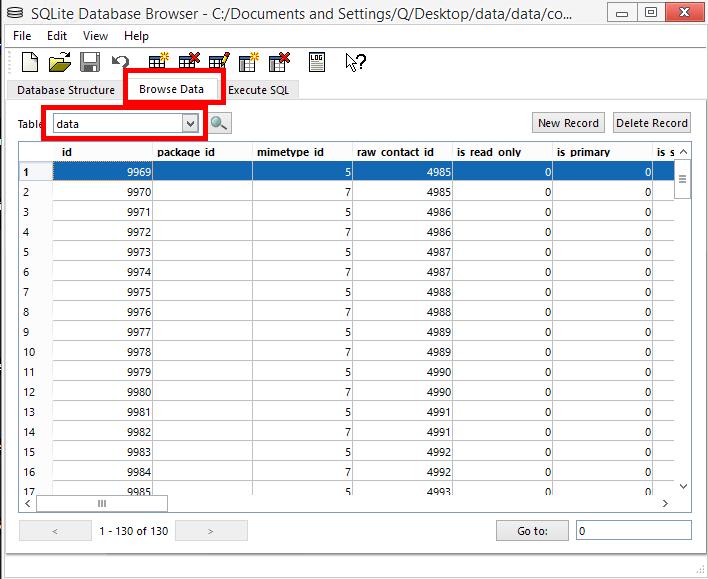 \data\data\com.android.providers.contacts klasörünü açın ve contacts2 dosyasını Sql Lite Browser programına sürükleyip bırakın. Üst kısımda Browse Data sekmesine gelerek hemen altındaki table sekmesini açıp data yazan kısmı seçin, burası rehberiniz.