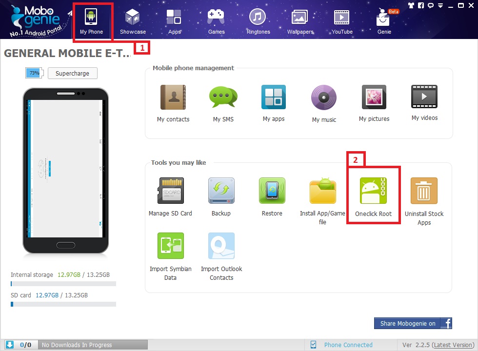 Bağlantı gerçekleştiğinde programın ana ekranından My Phone seçeneğine tıklayın. Sonrasında da Oneclick Root > Root Now diyerek root işlemini başlatın: (Bu işlem için bazı dosyalar internetten indirilecek.)