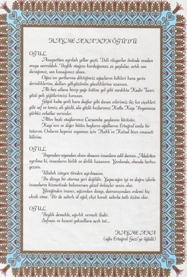 Hayme Ana oğlu Ertuğrul’u 1191 senesinde Ahlat’ta dünyaya getirdi.  Gündüz Alp ve oba bu doğumu büyük sevinçle karşıladılar. “Deveden buğra,  attan aygır, koyundan koç kırdırarak” günlerce süren şölen yaptılar.  Küçük çocuğun sağ kulağına ezan sol kulağına kamet okuyup ak sakallı oba  uluları “Ertuğrul” adını verdiler. Hayme Ana’nın başına al basmasına  karşı kırmızı yaşmak bağladılar. Toprak evini gelin odası gibi  süslediler. Meydanlarda cirit oynandı, güreş tutuldu, ok atıldı. Hayme  Ana’nın gözünün nuru evladı Ertuğrul, Alper Tunga’nın 58. ve Mete nin  45. kuşak torunudur. 15. yy. Osmanlı hanedan tarihçisi Bayati böyle  belirtir. Oğuz Kağan adıyla tebcil edilen Mete bütün Türk Hanedanlarının  atasıdır. Tanrı Oğuz Kağan nesline Kut vermiştir. Bu kuta sahip  olmayanlar meşru hakan sıfatı ile Türkleri yönetemezdi. Bu inanış İslami  devirlerde de aynen devam etmiştir. Ertuğrul’un doğumu Ahlat Türkmen  halkını sevince gark etmiştir.