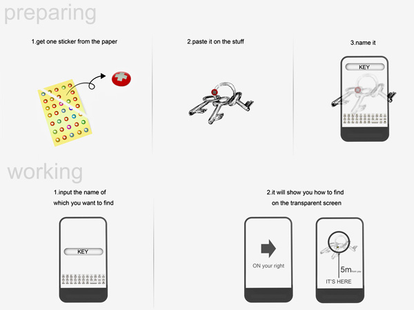 Chu Wang'ın fikri bu konsept, sürekli birşeylerini kaybeden unutkanların kurtarıcısı olabilir. Sistem şu şekilde çalışıyor; kumanda, cüzdan, telefon gibi kaybolmaya müsait eşyalarınızın üstüne küçük bir çıkartma yapıştırıyorsunuz. Herhangi bir kayıp durumunda aleti odaya doğru tuttuğunuzda size nerde olduğunu mesafesine kadar bildiriyor.