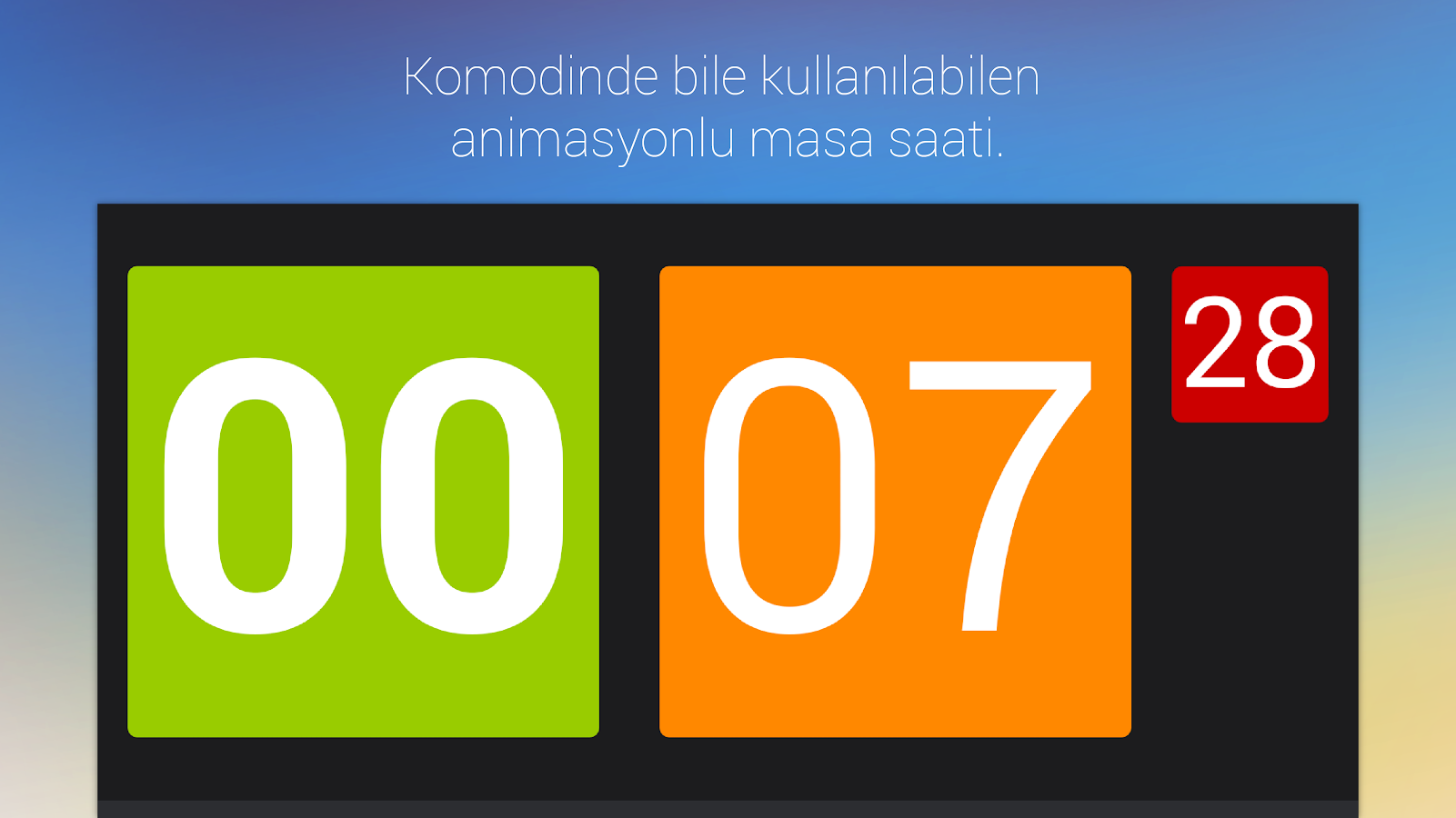 Uygulama, Çekici renkli bir saat ekran olarak yatay biçimde çalışır.