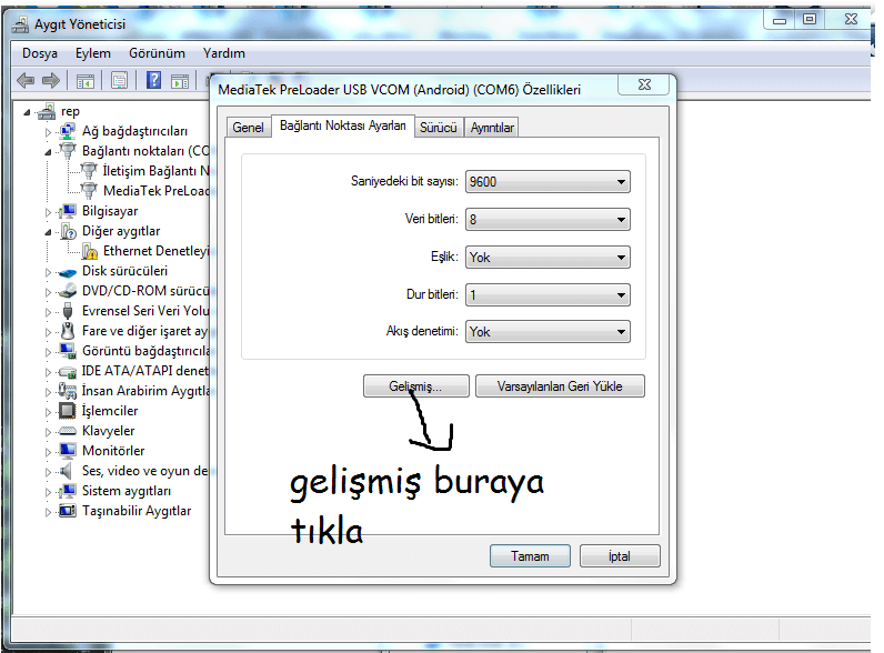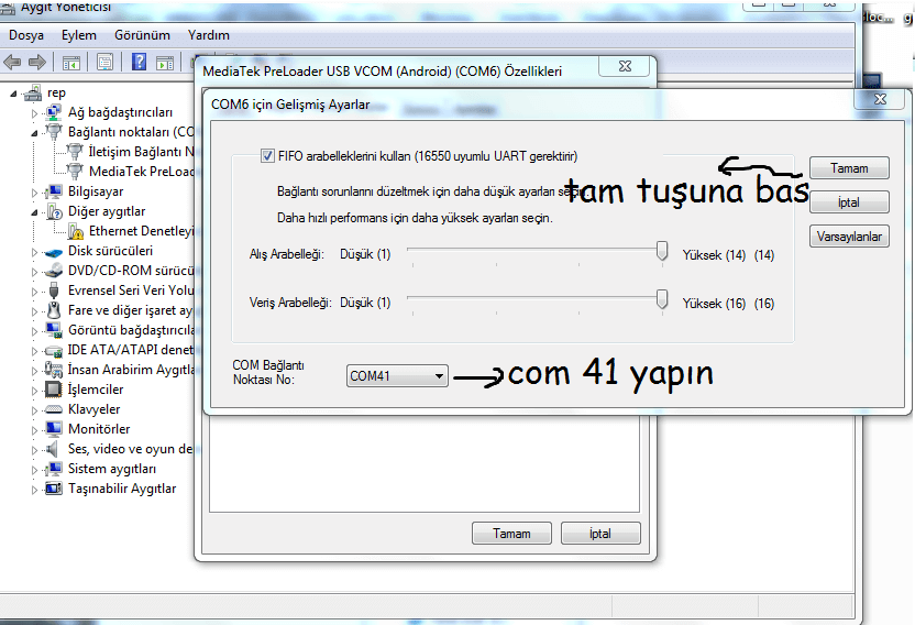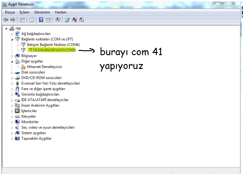 yukardaki işlemleri yaptıktan sonra aygıt yöneticisinden com 41 yapıp çıkıyoruz
