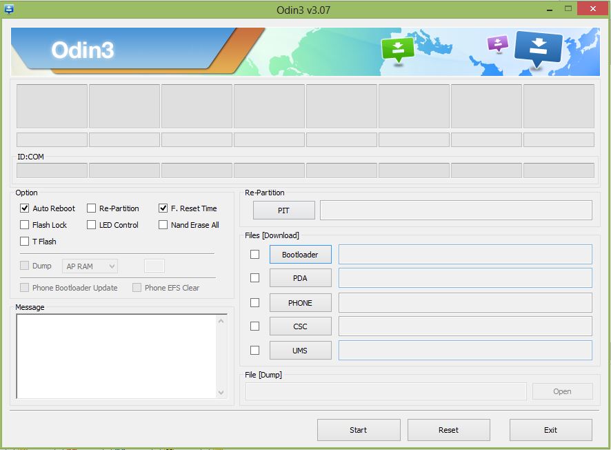 • 2.Klasör içerisindeki Odin3.exe ye sağ tıklayın ve Yönetici olarak çalıştırın. karşımıza bu ekran gelecek.