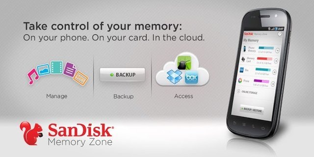 SanDisk Memory Zone ile hafıza kartınızda veya telefon hafızasında yer alan dosyaları kolayca yerlerini değiştirebilir ve Cloud (bulut) sunucunuza kolayca yedekleyebilirsiniz. SanDisk Memory Zone'un desteklediği cloud uygulamaları arasında Dropbox, Box, Picasa, Google Docs, SugarSync, SkyDrive ve Facebook yer alıyor.