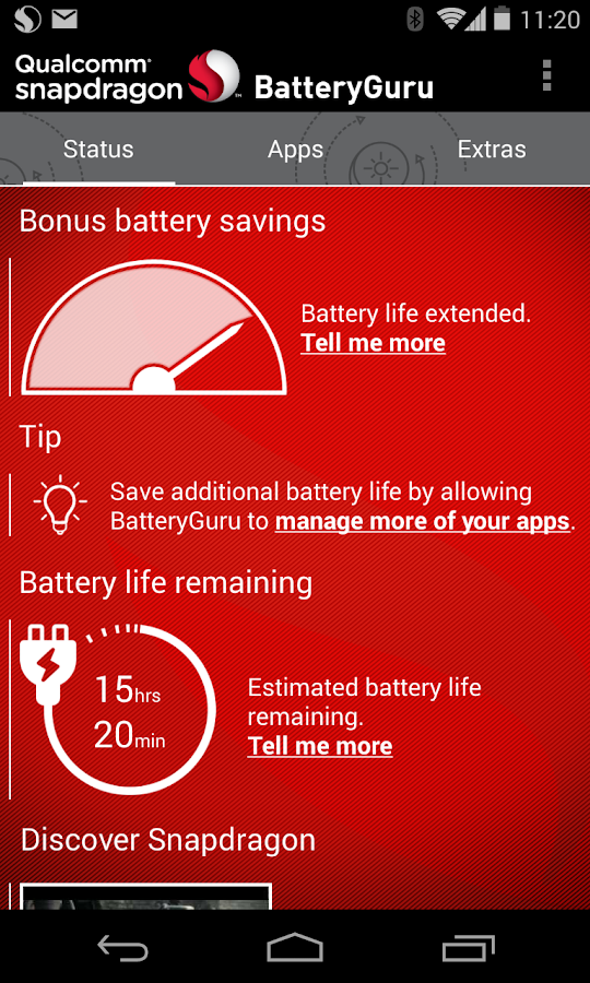 Snapdragon? BatteryGuru, Snapdragon mobil işlemcili telefonlarda cihazın işlevselliğini optimize eden akıllı değişiklikler yaparak pil performansını ve genel kullanıcı deneyimini geliştiren bir pil tasarruf uygulamasıdır. Bu uygulama:
