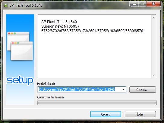 SP Flash Tool 5.1540 kurulabilir sürüm "C:\Program Files\SP Flash Tool\SP Flash Tool 5.1540" dosya yoluna kurar ve masaüstüne kısayol atar..